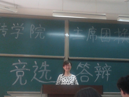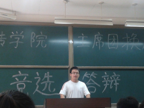 略去繁琐的会议流程,竞选同学直接按顺序进行演讲。第一个上台的是宣传部部长陈浩文,他竞选的职位是团委副书记。他总结了自己两年来的工作,讲述了从部员到部长的转变带来的收获。最后讲述了对未来的规划。接下来还有秘书处副秘书长冯雪娇、组织部部长江卉也竞选团委副书记。