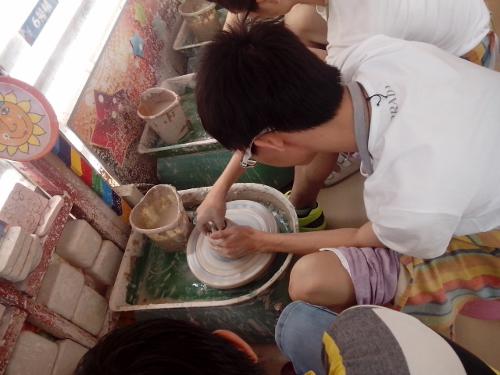 中午1点多我们来到了陶艺吧,看着陈列的一件件成品,我们不禁跃跃欲试,我们转着机器在一块块的泥巴里,感受着陶器的魅力,享受着不一样的快乐,我们做出了不同的形状,但我们的心情是相同的,因为陶器的魅力给我们带来了相同的快乐,经过了几小时的体验,我们也都有了自己的成果。我们每一个人在兴奋中都体会着满足的感觉。