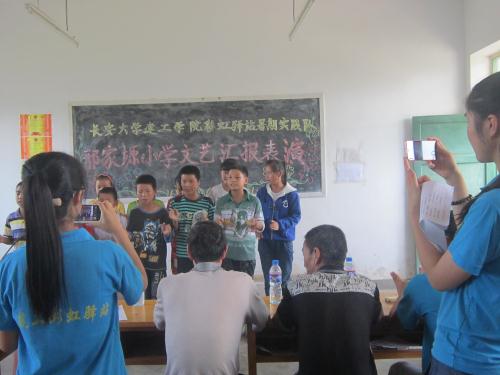 面对着长安大学指导员老师郭曼、当地分领导老师以及台下的观众,上台的孩子们并没有紧张胆怯,不但如此,他们的表演效果甚至远远超过了所有人的预料。汇报表演按照学生代表发言,节目表演,领导老师讲话的顺序圆满完成。表演结束后,志愿者们与孩子们合影留恋,让这一刻快乐而又短暂的时光永远定格。