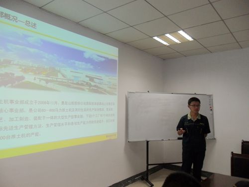 早9时,我们顺利到达并与接待老师会面。在负责人的带领下,我们来到了推土机事业部第一会议室,聆听了工会主席孔祥田对山推历史的介绍。他指出,当代大学生要沉住气,不浮躁,方能干出一番事业。稍后,西北工业大学08级毕业生郑权从“管理体系、辉煌历史与前景展望、文化建设”等几个板块为我们讲述了推土机事业部的概况。中午12时,在一片掌声中我们结束了上午的学习。