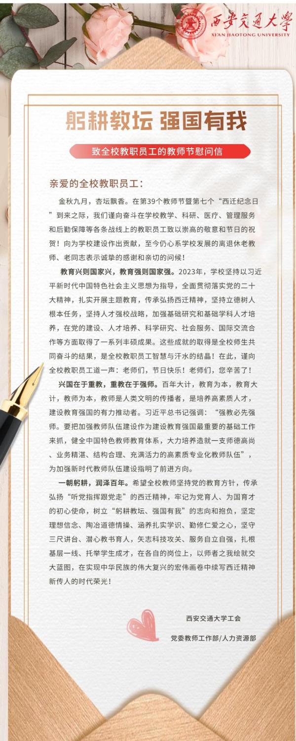 为庆祝第39个教师节暨第七个“西迁纪念日”,激发全校教职员工“躬耕教坛 强国有我”的使命担当,近日,校工会系统秉持为教师服务、为发展聚力的工作理念组织开展了系列教师节活动。通过一封节日慰问信、两场爱心义诊、校院两级工会系统走访慰问和举办体育比赛等,让广大教师真切感受到学校的关心关怀,激发全校教职工奋进热情,凝聚团结力量。