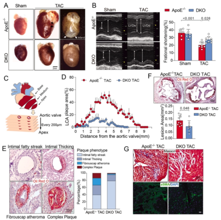 研究团队发现TAC(transverse aortic constriction)手术后的ApoE-/-小鼠心脏冠状动脉内皮细胞中Nogo-B表达明显上调。随后研究者应用ApoE-/-小鼠,构建了DKO(ApoE-/--Nogo-A/B)小鼠和内皮细胞特异性Nogo-A/B(ApoE-/-/Nogo-A/BECKO)敲除小鼠。行横主动脉弓缩窄术(TAC)7周后发现,敲除Nogo-B明显减轻了TAC 诱导的冠状动脉动脉粥样硬斑块的大小及主动脉根部的斑块面积。