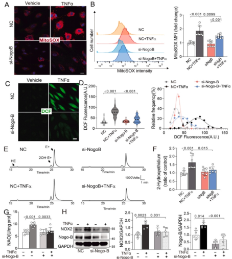 线粒体是细胞ROS产生的主要来源之一,它可以通过ROS致ROS释放(ROS induce ROS release),介导NADPH氧化酶(NOX)等其他来源ROS的生成。研究团队发现沉默内皮细胞中的Nogo-B可以抑制氧化应激反应,减少内皮细胞中的ROS含量。