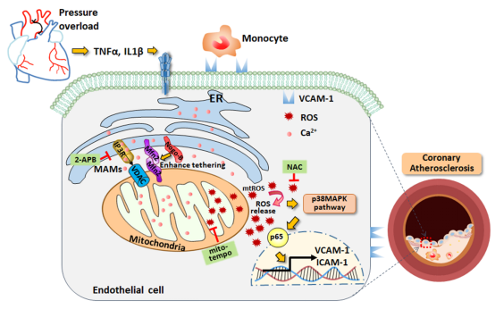 综上,该研究揭示了在压力超负荷的ApoE-/-小鼠心脏中,Nogo-B是促进冠脉内皮功能障碍和冠状动脉粥样硬化发生发展的关键调控因子。该研究通过应用活细胞钙成像、免疫共沉淀、电镜等实验手段证实Nogo-B是线粒体相关内质网膜蛋白的重要成员之一,能够通过与线粒体蛋白Mfn2相互作用维持内质网-线粒体结构与功能,调控内皮细胞中线粒体Ca2+转移与线粒体ROS产生。研究有望以Nogo-B为靶点,为防治冠心病提供新的理论基础。