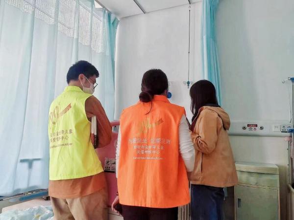 当天下午,到达西北妇女儿童医院儿内科二病区后,志愿团队全体成员首先进行了严格消杀并全员佩戴口罩,为患儿健康负责;随后做好志愿服务登记,确保信息透明可查;接着在金丝带工作人员的带领下兵分两路,分别前往病区和活动室开展患儿陪护服务。