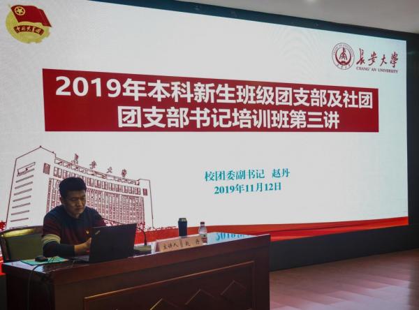 11月12日晚19点,由校团委主办的长安大学2019年本科新生班级团支部及学生社团团支部书记培训第三讲在长安文化艺术中心三楼多功能厅举行。校团委副书记赵丹出席并担任主讲,各分团委(团总支)、各团工委学生兼职副书记、全体2019级班级团支部书记、学生社团团支部书记代表参加本次培训,本次培训由校团委组织宣传部主任邱贞龙主持。