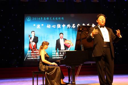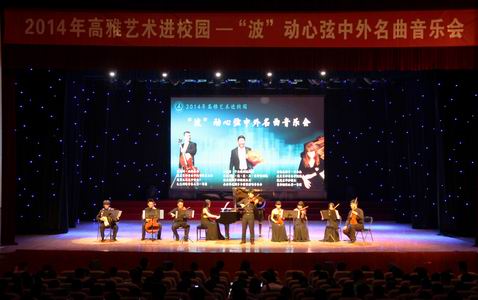 “波”动心弦,奏响激情,走近大师,感受经典。6月2日晚,2014年高雅艺术进校园——“波”动心弦中外名曲音乐会在我校渭水校区长安文化艺术中心大礼堂举行。中国著名旅欧男中音歌唱家刘克清携波兰大提琴家托马斯·施特拉尔和钢琴家安格尼斯卡·布鲁拉联袂为我校师生带来一场古典音乐的视听盛宴。校长助理朱杰君出席活动,校新闻宣传中心、学工部、校团委、渭水校区办、汽车学院等部门负责人及我校千余名师生共同聆听本场音乐会。音乐会由刘克清先生主持。