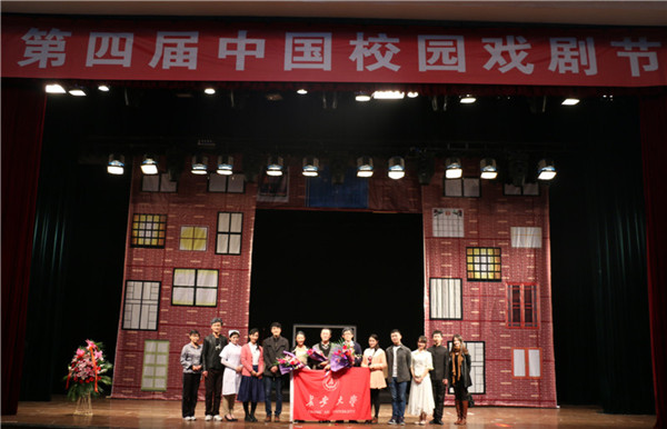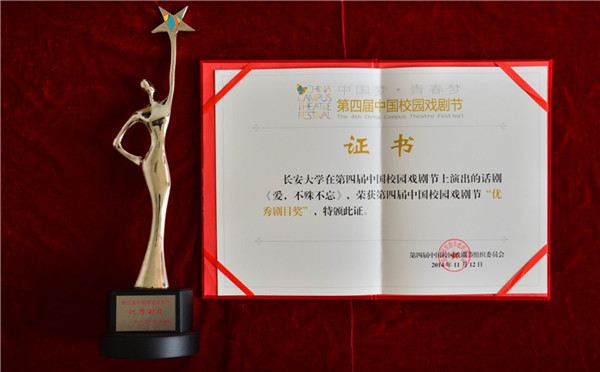 11月3日—12日,由中国文联、教育部、上海市人民政府主办,中国戏剧家协会、上海市文联等共同承办,以“中国梦·青春梦”为主题的第四届中国校园戏剧节在上海举行。由我校文传学院曲妍同学编剧、文传学院艺术教育中心吴鹏老师担任编剧及导演、信息学院陈晏老师担任艺术指导的原创话剧《爱,不殊不忘》作为陕西省唯一代表、西北地区唯一参演剧目(普通组),荣获第四届中国校园戏剧节最高奖——中国戏剧奖·校园戏剧奖(优秀编剧奖),是我校迄今为止参加同类比赛取得的最高荣誉,实现了历史性突破。同时,我校还荣获优秀剧目奖、优秀组织奖。