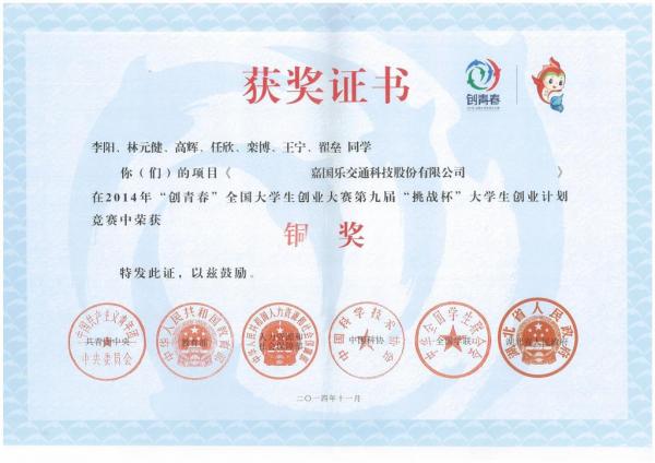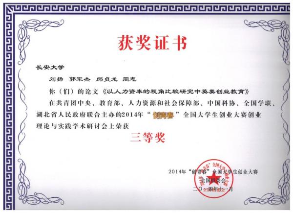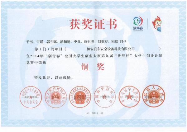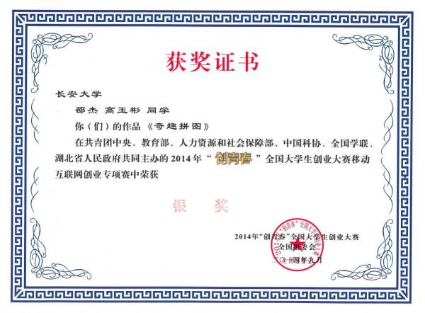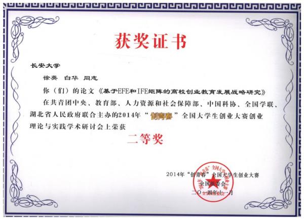 据统计,本次大赛自今年1月启动以来,全国2000多所高校参加了相关赛事,近10万件作品参与校级竞赛,近2万件作品参加了省级竞赛,最终来自209所高校的385件创业项目进入全国终审决赛,形成了校级、省级和全国三级赛制。我校在校内赛广泛征集作品的基础上,组织举办各类创业计划赛培训讲座,并积极为参赛队伍提供咨询服务,共计上报作品六件,全部获奖。在“挑战杯”创业计划竞赛中,李阳等的作品《嘉国乐交通科技股份有限公司》、于彤等的作品《恒安汽车安全设备科技有限公司》分获全国铜奖。马兆鑫等同学的《西安恒泰网络科技有限公司》获创业实践挑战赛铜奖。在本次移动互联网创业专项赛我校信息学院邵杰、高玉彬的作品《奇趣拼图》获得全国银奖,信息学院郭星等的作品《键盘灯终结者》和经管学院张亿彤等的作品《西安长青网讯网络科技有限责任公司》获得全国铜奖。我校党委副书记白华与与研究生徐英所著《基于EFE和IFE矩阵的高校创业教育发展战略研究》、研究生徐英的《高校创新创业教育绩效评价研究》、研究生刘云博的《新媒体时代高校创业教育创新研究》三文获大赛学术研讨会二等奖,校团委学生创新创业教育委员会办公室郭军杰、刘扬、邱贞龙的文章《从人力资本的视角比较研究中英美创业教育》获征文三等奖。