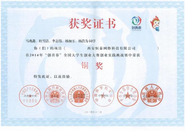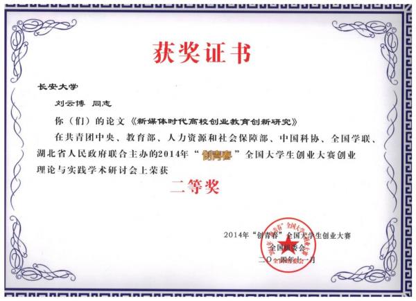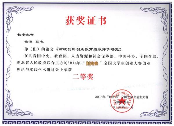 2014年11月4日,由共青团中央、教育部、人力资源和社会保障部、中国科协、全国学联、湖北省人民政府主办的“创青春”全国大学生创业大赛在湖北武汉落下帷幕。本届“创青春”全国大学生创业大赛以“中国梦,创业梦,我的梦”为主题,以培养创新意识、启迪创意思维、提升创造能力、造就创业人才为宗旨,开创了“3+2”全新赛制(“3”是指“挑战杯”创业计划竞赛、创业实践挑战赛、公益创业赛三项主体赛事,“2”是指MBA、移动互联网创业两项专项赛事)。我校在本次大赛中喜获移动互联网创业专项赛银奖1项,铜奖2项。“挑战杯”创业计划竞赛铜奖2项,创业实践挑战赛铜奖1项。并在2014“创青春”全国大学生创业理论与实践学术研讨会上斩获二等奖3项,三等奖1项,四篇论文全部被收入会议论文集。