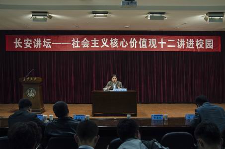 2014年10月30日晚,“社会主义核心价值观十二讲进校园活动”在我校长安文化艺术中心多功能厅举办。西北政法大学马克思主义教育研究院院长,陕西省政协常委、社会和法制委员会副主任刘进田教授为我校师生作“自由、平等、公正、法治价值及其内在秩序”报告。报告会由校团委副书记张永主持。