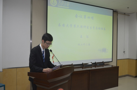 会议第一项,长安大学团委副书记张永老师宣读了《关于长安大学2014-2015学年校级学生组织主要干部聘任的通知》。会议第二项,长安大学学工部副部长王卫老师为本届研究生会主席团成员颁发了聘书。会议第三项,第本届研究生会主席王飞做工作报告。报告中,王飞回顾了上届研究生会在学术服务、文体活动、媒体建设、提案调研、对外交流及志愿服务等方面的工作进展,对所有关心、帮助和支持研究生会工作的领导老师及同学表示感谢。同时,对本届研究生会的工作进行了展望。结合不同部门特色及需求,对各部门制定了个性化的发展方针。会议第四项,长安大学第六期研究生青马班班长王征对第六期研究生青马班工作进行了总结。会议最后,校团委办公室主任、研究生会秘书长刘艳艳老师对全体研究生会干部提出了三点要求:对工作要极致追求、对事情要极致负责、对个人有极致标准”。至此,长安大学第八届研究生会成立大会圆满落幕。