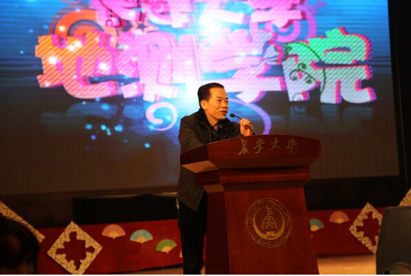 地测学院院党委书记杜福元致辞。他介绍了地测学院在教学科研、师资力量、实验室建设、学生管理、学生考研与就业情况等方面的情况。对各位领导出席晚会表示感谢,对2014级新生表示热烈欢迎,并对同学们提出了殷切希望。