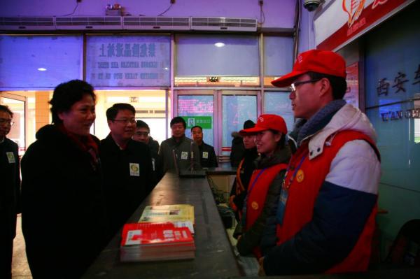 启动仪式结束之后,省委宣传部副部长、省文明办主任龚晓燕、团省委书记李豫琦等领导看望慰问了在西安车站服务的来自长安大学的青年志愿者,深入了解此次志愿服务活动的具体情况,询问了志愿者参加活动的心得感受,对志愿者昂扬的精神状态、饱满的工作热情、高度的社会责任感给予了肯定,并鼓励志愿者用自己的贴心周到的服务,热情灿烂的笑容诠释志愿者精神,真正成为全社会传递爱心、传播文明,弘扬青春正能量的示范者和引领者。