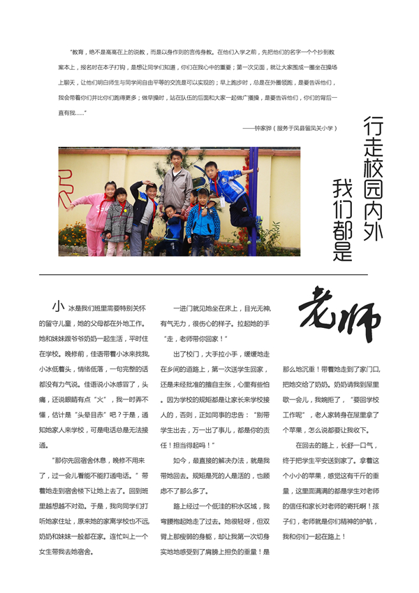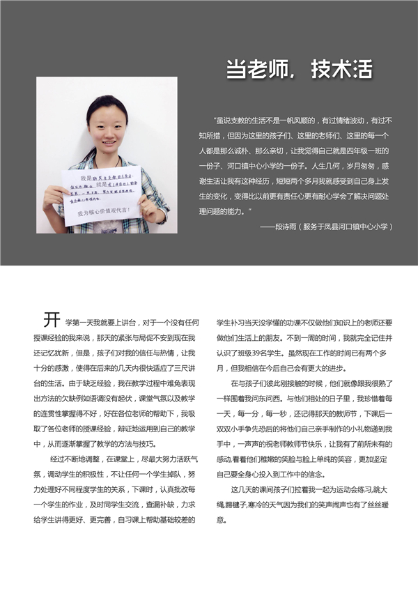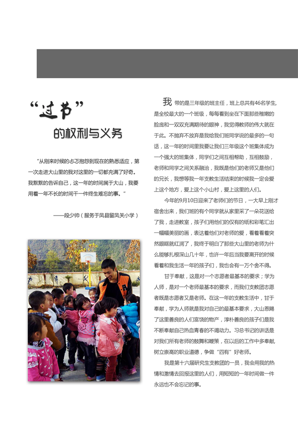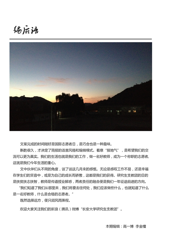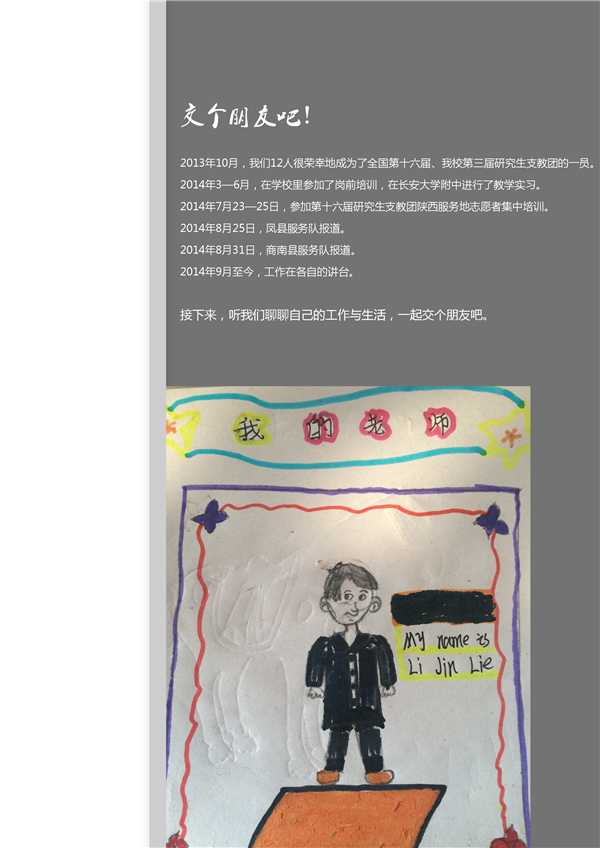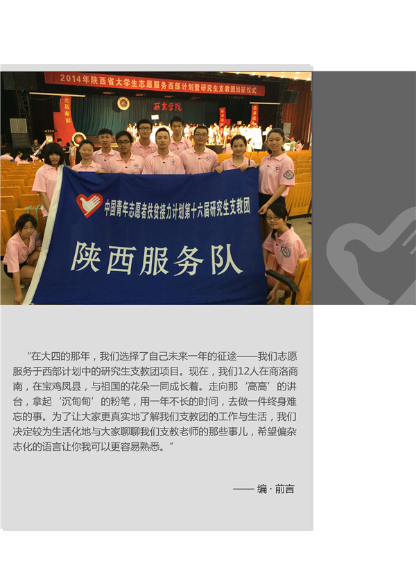 “在大四的那年,我们选择了自己未来一年的征途——我们志愿服务于西部计划中的研究生支教团项目。现在,我们12人在商洛商南,在宝鸡凤县,与祖国的花朵一同成长着。走向那‘高高’的讲台,拿起‘沉甸甸’的粉笔,用一年不长的时间,去做一件终身难忘的事。为了让大家更真实地了解我们支教团的工作与生活,我们决定较为生活化地与大家聊聊我们支教老师的那些事儿,希望偏杂志化的语言让你我可以更容易熟悉。”