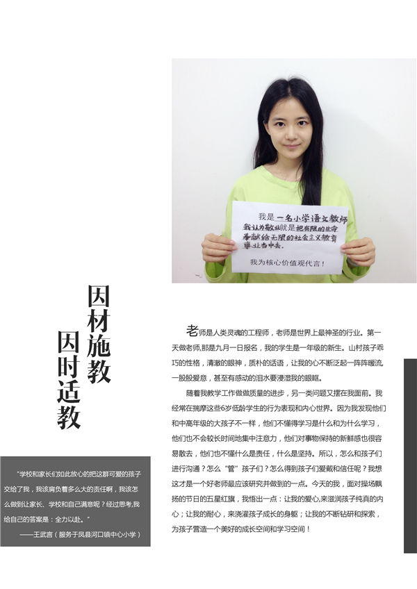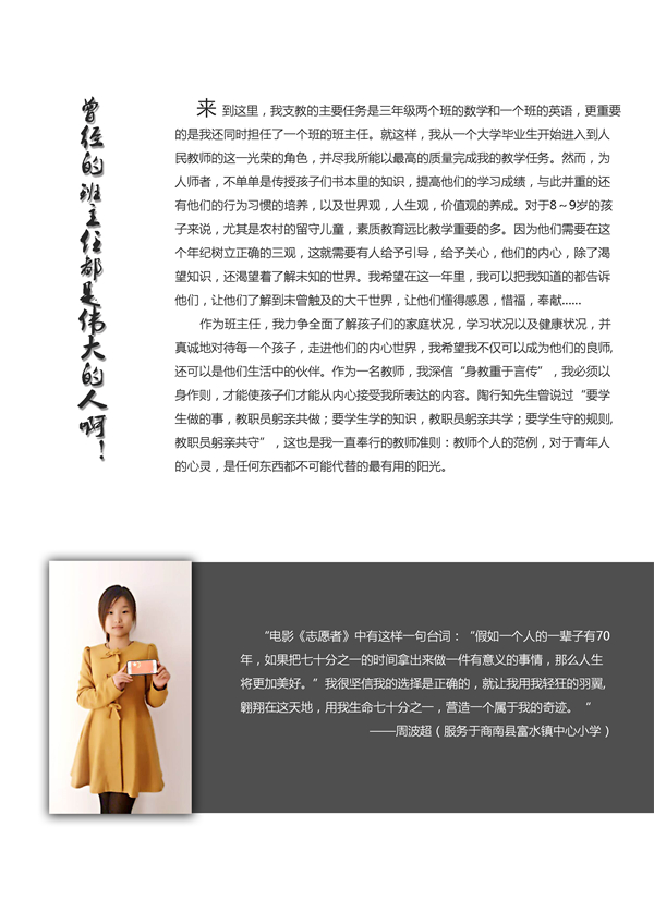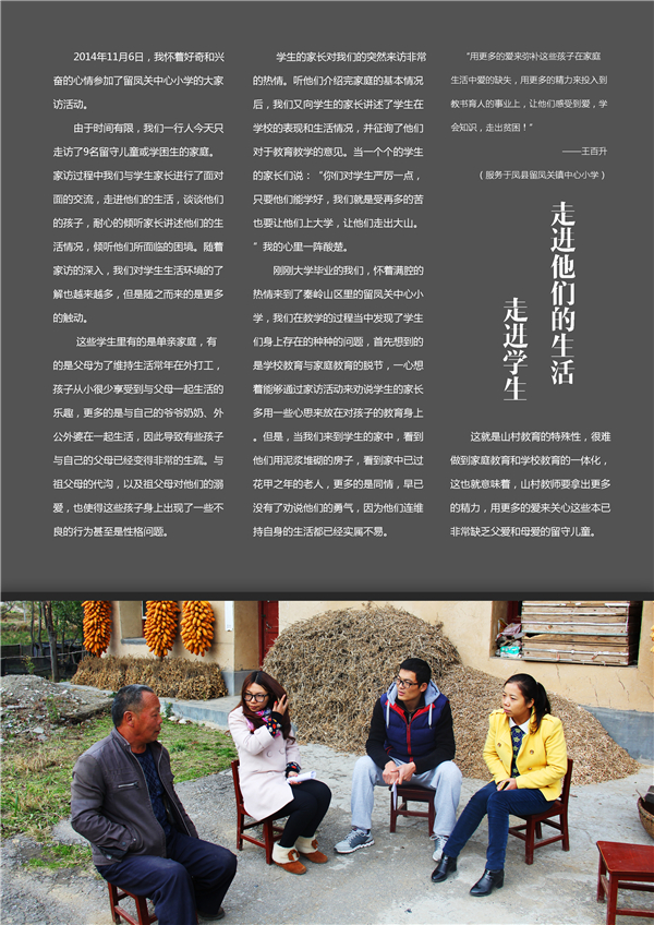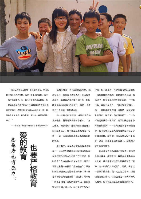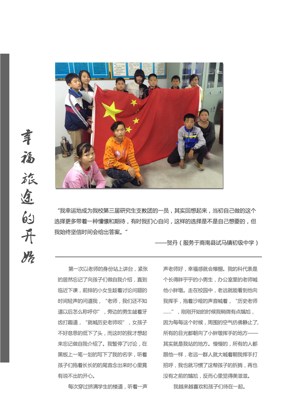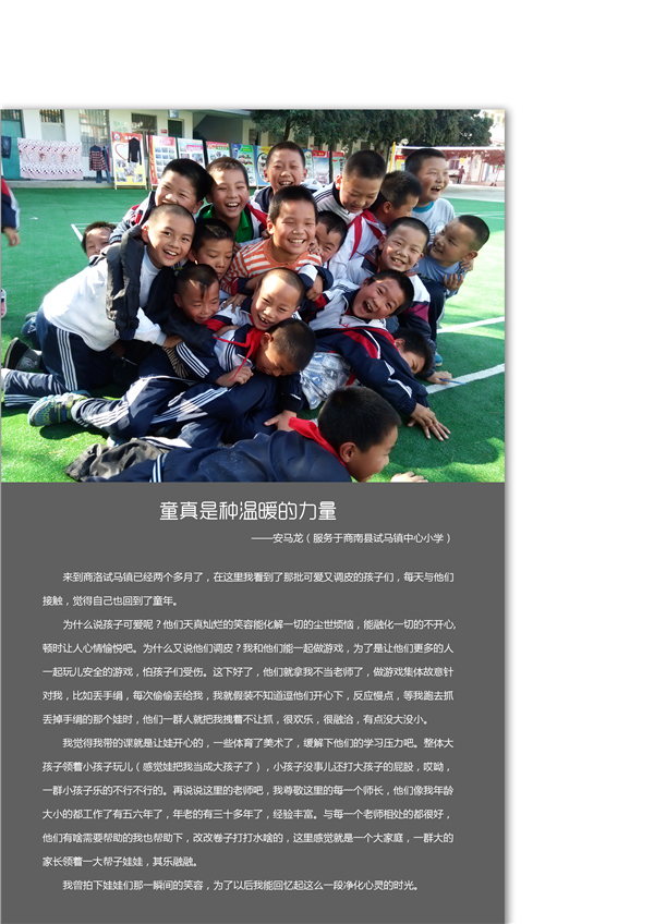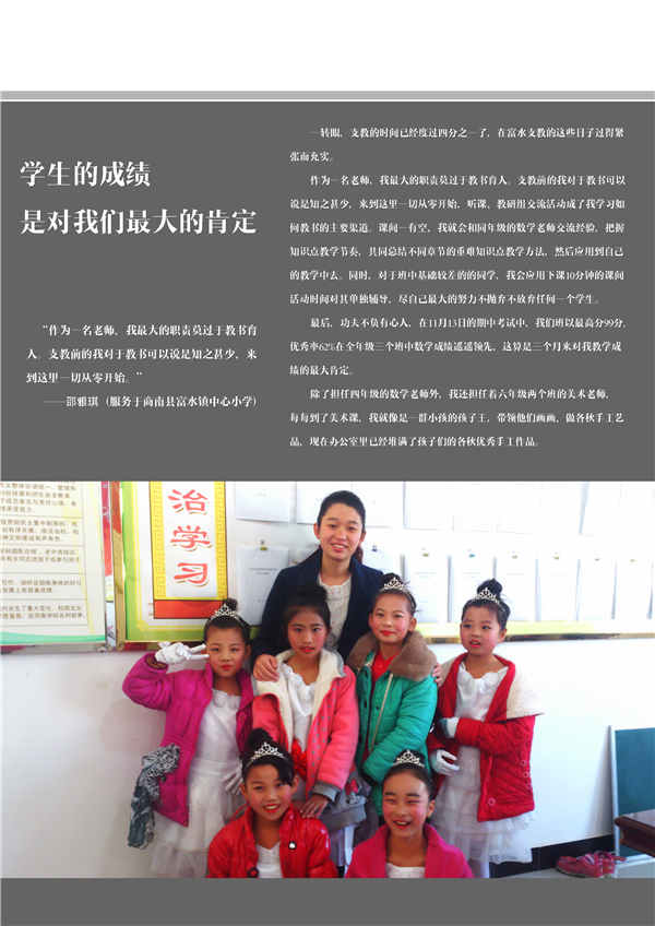 “在大四的那年,我们选择了自己未来一年的征途——我们志愿服务于西部计划中的研究生支教团项目。现在,我们12人在商洛商南,在宝鸡凤县,与祖国的花朵一同成长着。走向那‘高高’的讲台,拿起‘沉甸甸’的粉笔,用一年不长的时间,去做一件终身难忘的事。为了让大家更真实地了解我们支教团的工作与生活,我们决定较为生活化地与大家聊聊我们支教老师的那些事儿,希望偏杂志化的语言让你我可以更容易熟悉。”