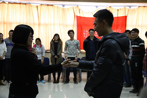 活动中,李雪飞老师让“青马”班学员们围成一个圆圈,通过“击掌”“搓手”等活动,使彼此相互熟悉,感受彼此的“能量”,让学员们明白,每个人都是不可或缺的一个点,所有人的存在,才构成一个整体。通过“有家真好”“鸡蛋成人”等小游戏使大家充分热身,全身心融入到活动中,使队员们更加明白“成长不容易”、“机会只有一个,不能轻易放弃”、“一步成功,并不值得羡慕”等人生哲理。随后,青马”班学员们通过“接龙”“捶背”“排序”一系列活动进一步拉近了距离,学员们分为两人一组,相互介绍三个优点,之后讨论规模扩大,分为八人一组,通过“滚雪球”的方式互相自我介绍,现场的气氛变得更加活跃。最后,李雪飞老师提出三个问题,分别是“加入学生组织的三个收获”、“上大学最遗憾的三件事”和“近期需要完成的三个目标”,学员们在纸上写出自己的经历和想法,组内相互分享后,由组内代表向大家总结发言。