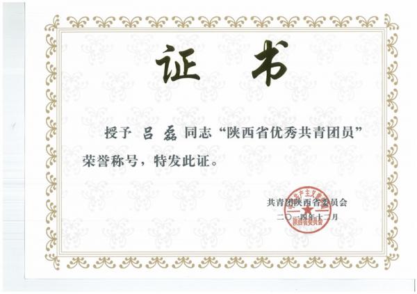 机械学院学生吕磊荣获“陕西省优秀共青团员”
