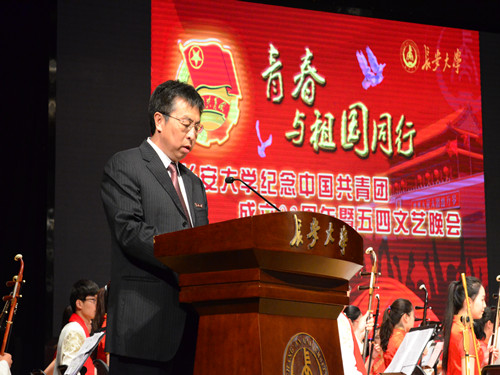 演出开始前,校党委副书记白华致辞。首先,他代表学校党政,向学校广大团员青年、各级共青团组织、广大共青团干部致以诚挚的问候和美好的祝愿。他指出,我校共青团在组织引导服务青年、维护青年合法权益、组织青马工程、丰富校园文化、开展创新创业、社会实践、志愿服务等方面做了大量卓有成效的工作。他对全校团员青年提出了四点希望:第一,希望广大青年坚定理想和信念,自觉担当复兴祖国的责任;第二,希望广大青年能够刻苦学习,虚心进取,勇于创新,争当科学全面发展的人才;第三,希望广大青年矢志艰苦奋斗,强调了艰苦奋斗的重要性;第四,希望广大青年锤炼高尚的品质,努力成为一个德才兼备、内外兼修的人。