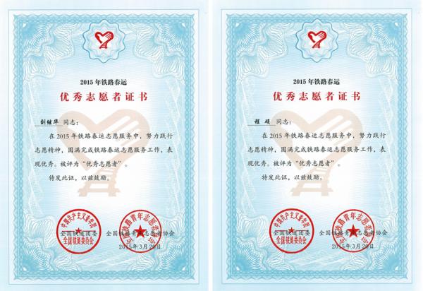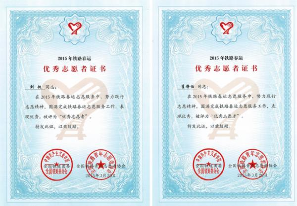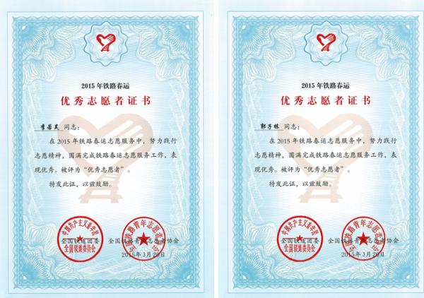 据悉,全国铁道团委授予东北农业大学青年志愿者协会等89个志愿者组织“2015年铁路春运青年志愿者先进集体”称号,授予程文静等699名青年志愿者“2015年铁路春运优秀青年志愿者”称号。我校团委将进一步响应号召,不断总结春运立功竞赛活动的成功经验和好的做法,创新工作载体,完善铁路春运志愿服务长效机制。受到表彰的先进个人将以荣誉为动力,再接再厉,不懈进取,继续为春运志愿服务工作作出贡献。