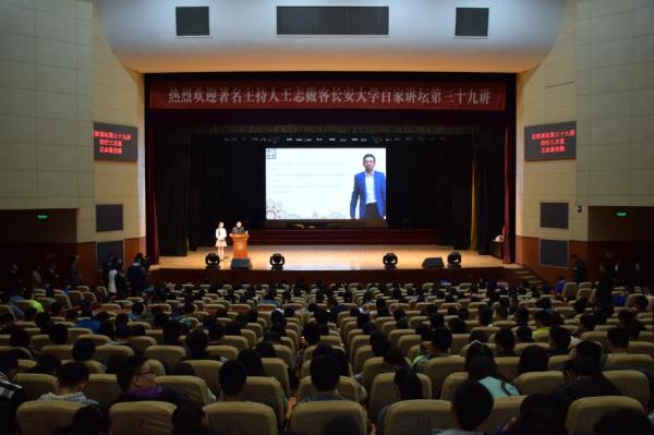 2015年10月30日下午,百家讲坛第三十九讲在长安大学渭水校区长安文化艺术中心大礼堂举行。前中央电视台著名主持人、记者王志为广大师生作了题为“西行三万里,王志看丝路”的专题讲座。本次讲座由长安大学学生会副主席李婧菲主持。长安大学千余名学子共同聆听了此次讲座。