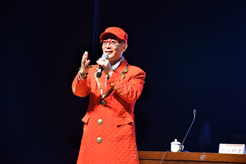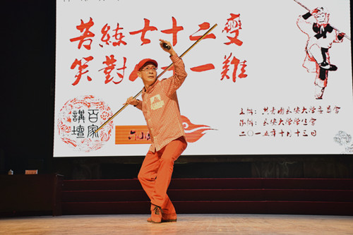 在讲座接近尾声时,激昂明快的《通天大道宽又阔》缓缓响起,章金莱先生一身红衣,精神抖擞,挥舞金箍棒,再现了美猴王的飒爽英姿,点燃了讲座现场的气氛。
