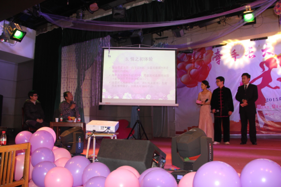 第一位男嘉宾郑晓晓成熟稳重,为现场女嘉宾和观众带来太极拳表演,赢得阵阵掌声;二号男嘉宾能歌善舞,第二段VCR后仍有三名女嘉宾为他留灯,最终他坚持选择心动女生,却遭到拒绝而遗憾退场。三号男嘉宾梁新阳以一首饱含深情的《冰雨》上场,现场反应热烈;四号男嘉宾鲁瑜高大帅气,在视频中尽显个人魅力,获得了在场观众的阵阵喝彩;五号男嘉宾杨永奎以自己的歌声和求学的经历感动了现场观众。期间进行的抽奖环节,更是将活动推向了高潮。下一部分则是男生权力,共上场7名男嘉宾和2位女嘉宾,在经过男嘉宾向心动女生表白和神秘女嘉宾选择其心动男生并进行互动后,整场活动最终以两对情侣牵手成功圆满结束。整个活动中段联合老师和王赟老师的点评穿插其中,妙趣辛辣,言语幽默,积极引导同学们建立良好的婚恋观,引得全场观众阵阵欢呼。舞台旁微信墙上妙语连珠,舞台下欢呼声此起彼伏。