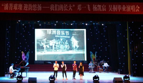 2016年5月19日晚, “潘菁璀璨,迎韵悠扬——我们的长大”邓一飞、杨凯宸、吴桐毕业演唱会在长安文化艺术中心大礼堂举行。党办、校团委、学工部、渭水校区办、学生就业处、公安处负责人,经管学院、信息学院、地测学院、资源学院、建工学院党委副书记出席了此次晚会,千余名师生共同观看演出。