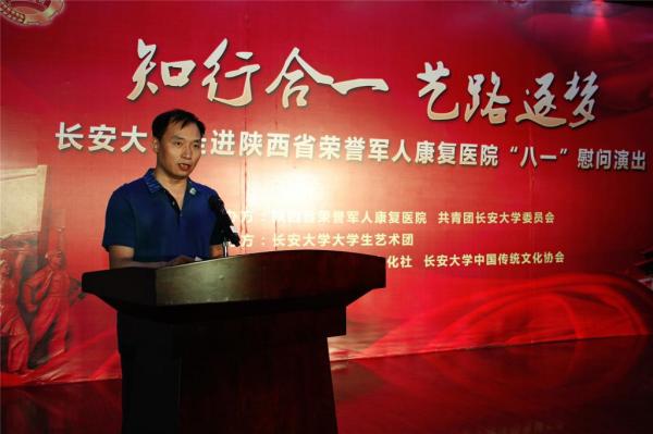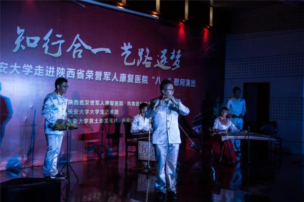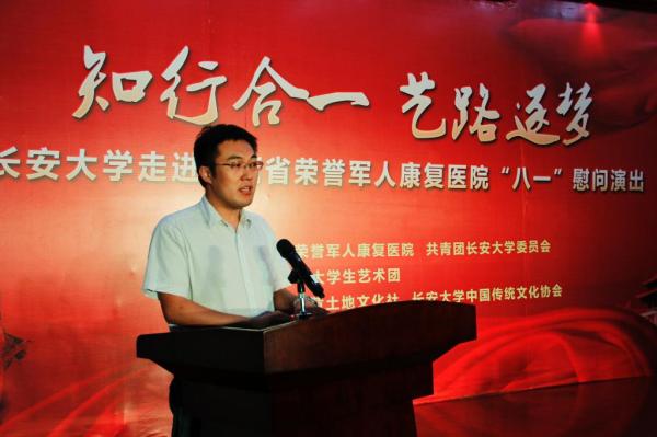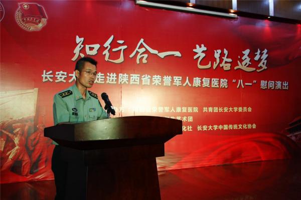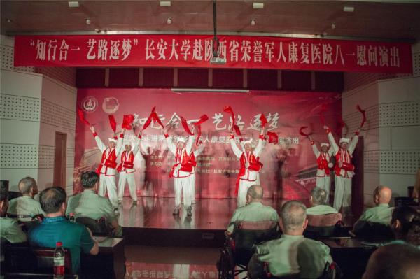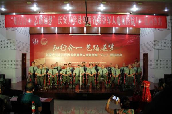 7月12日晚,长安大学八一慰问演出在陕西省荣誉军人康复医院多功能报告厅成功举行。值此建党95周年、红军长征胜利80周年到来之际,由我校大学生艺术团、黄土地文化社、中国传统文化协会的文艺骨干组成的“知行合一艺路逐梦”暑期社会实践队为陕西省荣誉军人康复医院休养的伤残军人、68331部队官兵代表以及优抚医疗一线的医院职工近三百余人带来了一场青春洋溢的精彩演出。陕西省荣誉军人康复医院党委书记、院长陈继强,68331部队总工程师孟翔中校,长安大学团委书记张永及各单位有关领导出席了本次活动。