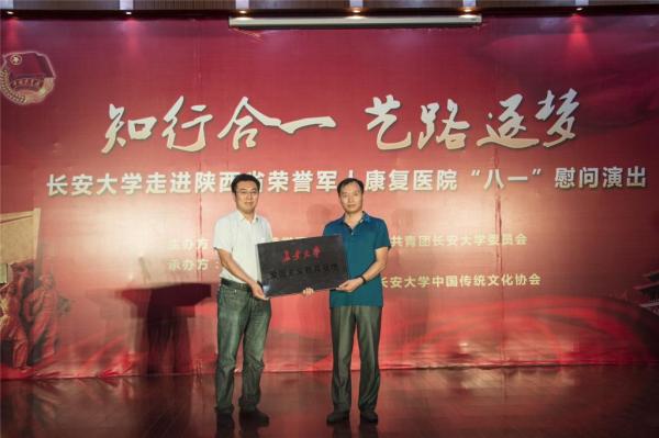 演出开始前,长安大学团委书记张永向陕西省荣誉军人康复医院授“长安大学爱国主义教育基地”牌,向68331部队授“长安大学暑期社会实践基地”牌。