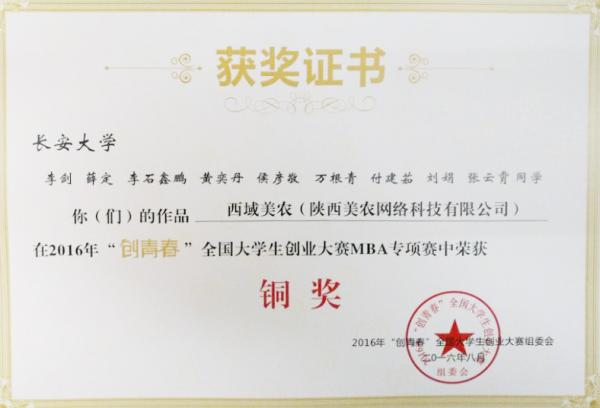 据悉,2016年“创青春”全国大学生创业大赛MBA/电子商务专项赛由共青团中央、教育部、人力资源和社会保障部、中国科协、全国学联和四川省人民政府共同主办,团省委和绵阳市人民政府承办。MBA专项赛作为本届“创青春”全国大学生创业大赛的专项赛事,要求参赛学生为就读于MBA专业的在校学生提交项目计划书,共入围作品100余个,最终决出了MBA专项赛拟授金奖项目10个、银奖项目22个、铜奖项目56个,其中陕西共获得MBA铜奖三项,分别为西安交通大学、长安大学、西安邮电大学项目。