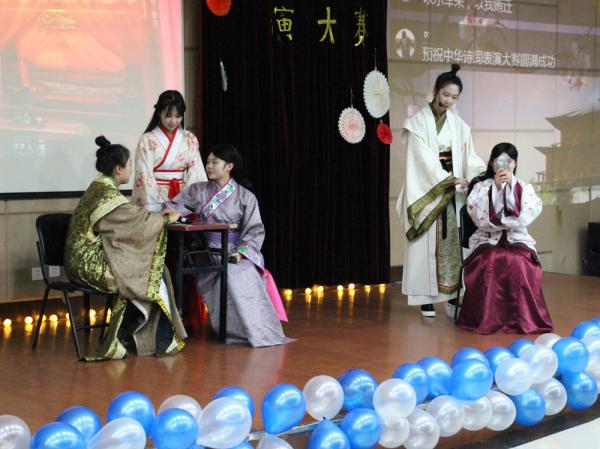 晚七时,大赛正式开始,从初复赛中脱颖而出的六组队伍同台竞技,各有千秋。表演形式丰富多样:有扣人心弦的戏剧,有优美动人的歌舞,有慷慨激昂的诗朗诵……有的节目幽默诙谐,极大地调动了观众的热情,而有的则以深厚的文学修养,准确的情感把握再现了古代诗歌的画面。经过激烈角逐,最终评出一等奖一名,二等奖两名,三等奖三名。