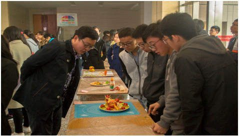 型果秀与美食改良两项比赛紧随其后。一个个精心改良的菜品通过大屏幕轮番展示,常见的饭菜在同学们的设计下变的别有风味。精妙的改良,幽默的设计让人耳目一新,忍俊不禁。与此同时,一个个别具匠心,富有创意的水果拼盘也纷纷完工,精巧的设计让人赞不绝口。美食品尝环节将活动现场气氛推向了高潮。老师和同学们凭票有序入场,大厨们精湛的厨艺赢得了大家的一致好评。