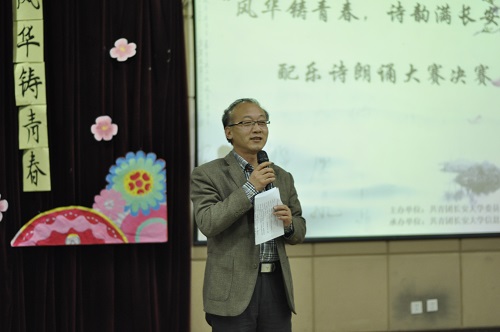 党委宣传部部长王耀文做以点评。他盛情夸赞选手们的朗诵,并称看到了当代大学生的风华正茂。他列举自己当年带学生的实例,强调诗歌拥有白话文无可比拟的意境,诗歌乃至传统文化对大学生的熏陶有重要意义;通过分享自己看小说和看电影的心得,鼓励大学生,多读诗,多读书,丰富自己的想象力;通过观看中央《新闻联播》、听广播电台等锻炼自己的普通话。最后他希望诗歌朗诵大赛能继续办下去,并且越办越好。