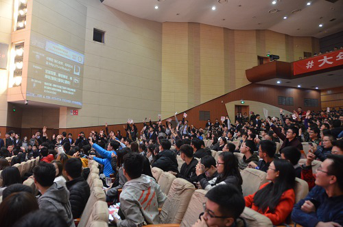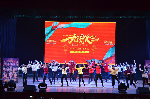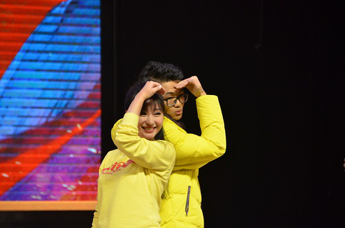 分享会伊始,伴随着欢快的音乐,柳岩以一种别出心裁的方式亮相,与我校学子一起带来了一段充满印度风情的《大闹天竺》的抱抱舞。同学们热情高涨,欢呼声雷动。