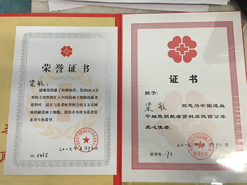 梁敏同学是我校第25例造血干细胞捐献者,我省第173位造血干细胞捐献者,也是全国第6465位成功捐献造血干细胞的志愿者。该同学在2013年成为中国造血干细胞捐献者资料库的一名志愿者,并于2016年12月19日与重庆市一位白血病患者配型成功。2017年5月12日,梁敏同学被中国造血干细胞捐献者资料库陕西分库授予“爱心使者”称号。