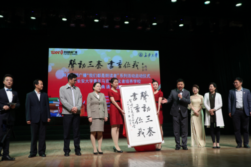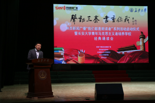 2017年4月23日是第22个“世界读书日”,为建设学习型校园,激励广大学生学习红色经典、传承红色基因、弘扬红色文化,由陕西广播电视台新闻广播、陕西省作家协会、共青团长安大学委员会、长安大学图书馆联合主办的“声动三秦·书香你我”陕西新闻广播“我们都是朗读者”系列活动启动仪式暨长安大学青年马克思主义者培养学校经典诵读会在长安大学渭水校区长安文化艺术中心盛大启幕。长安大学校长助理彪晓红、陕西新闻广播总监付银安、陕西省书法家协会代表、陕西省作家协会代表,长安大学学工部、渭水校区办公室、校团委、图书馆相关领导及近千名长安大学师生参加了读书活动启动仪式。