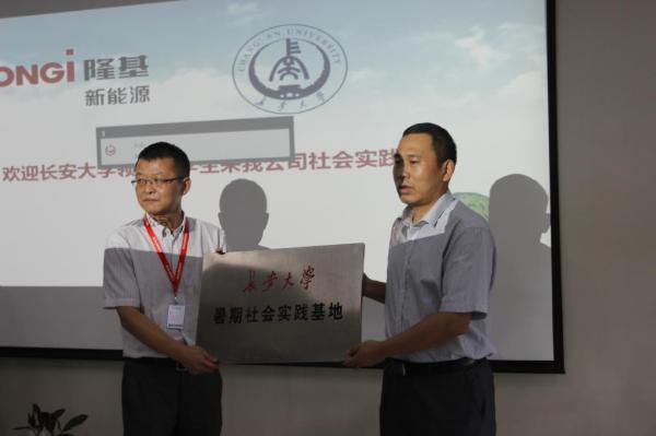 7月4日,长安大学工程机械学院与隆基绿能科技股份有限公司(简称“隆基股份”)共建长安大学学生社会实践基地授牌仪式在隆基股份中心会议室隆重举行。长安大学工程机械学院党委副书记赵武刚、院团委副书记冯迪、隆基股份新能源事业部市场总监武家英、工商业发展部张龙、赴隆基股份参观交流、接受培训的15名优秀本科生出席了授牌仪式。