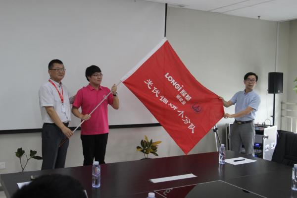 赵武刚副书记向武家英总监授“长安大学暑期社会实践”牌匾,武家英总监向长安大学“光之翼”社会实践队队长蔡冠雄授“长安大学——隆基股份光伏调研小分队”旗。