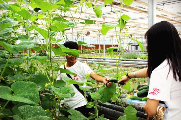 实践队员采摘有机瓜果