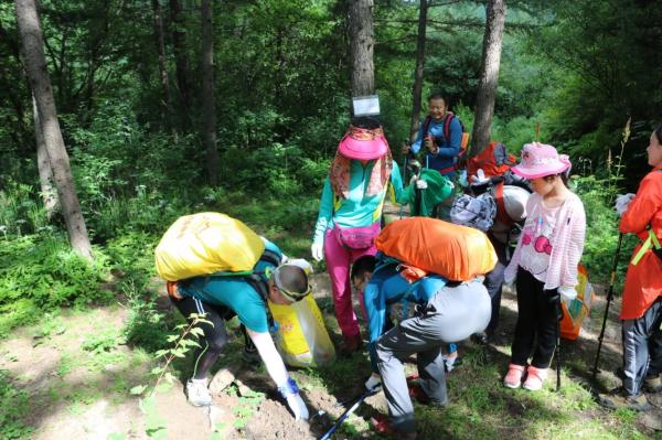 在曲曲折折的山路中,有野花有野草,在欣赏沿途风景的同时,每名成员背着一个麻皮袋用来装垃圾。在上山途中,垃圾也越来越多,各种气罐和食品包装随处可见。在下山途中,看着干干净净的草地,突然感觉大自然十分美妙,真不容人类去破坏。
