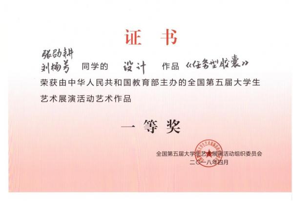 由我校机械学院教师乔涵指导,机械学院学生张劭耕、刘杨芳创作的作品《任务型胶囊》荣获设计类一等奖;由文传学院教师丁静、校团委教师张红指导的原创管乐作品《丝路古道》荣获器乐类二等奖;由信息学院教师陈晏、地测学院教师潘迎、校团委教师王斯琪指导的原创舞蹈作品《心中的东方红》荣获舞蹈类二等奖;由建筑学院教师刘鹏、张磊,校团委教师张红指导的大学生艺术实践工作坊作品《筑趣社——筑“造”梦想》荣获艺术工作坊艺术与生活类三等奖。我校荣获“高校优秀组织奖”。