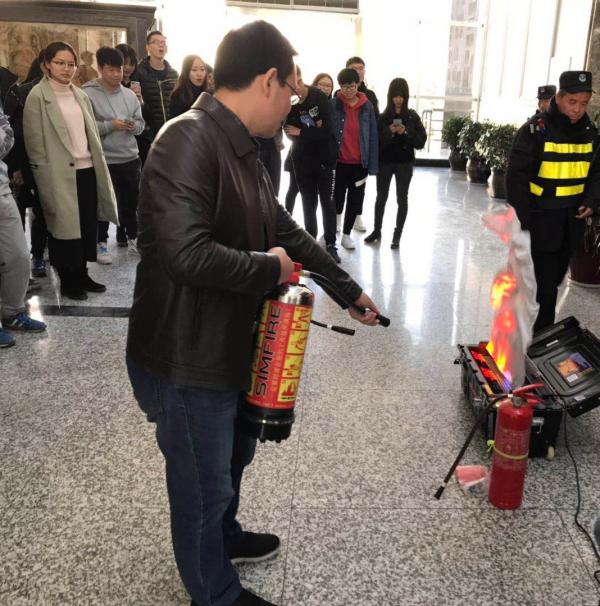王老师首先向大家细致地讲解了消防安全知识,结合真实的案例向大家阐述日常生活防火的注意事项和火灾疏散的相关知识。接着,他从灭火器的种类讲起,讲解了根据燃烧物不同火灾可分为固体、液体、气体、带电火灾等类别,并对灭火器的构造、使用技巧和注意事项进行了详细解说,并进行现场演示操作。