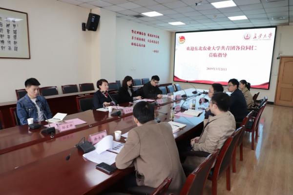 会上,姬国斌副书记首先对东北农业大学团委同仁来校调研表示热烈欢迎,他将我校共青团人员构成、组织框架等基本情况进行了一一介绍,对于我校团学新媒体工作从做好线上思想引领工作,加强线下学生团队培训和制定新媒体团队激励措施制度等方面进行了详细的介绍。根据调研主题内容,李阳副书记从我校五四推优评优及表彰流程,团员民主评议具体实施细节、基层团支部建设等方面进行了阐述。