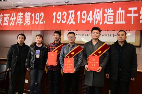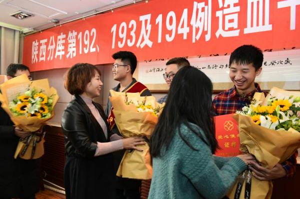 发布会上,崔岚主任、宋春红书记和赵武刚副书记为郑开明、王鹏、李泽坤三位同学颁发了“陕西省红十字会、中国造血干细胞资料库陕西分库爱心使者”和“捐献造血干细胞”荣誉证书,师生代表为郑开明同学,王鹏同学、李泽坤同学献上鲜花。