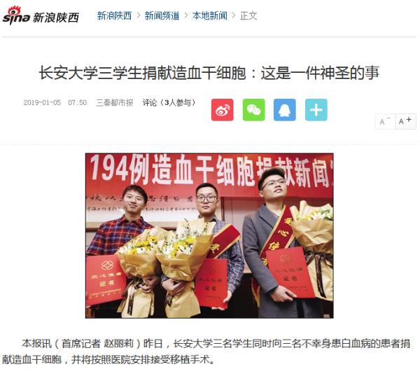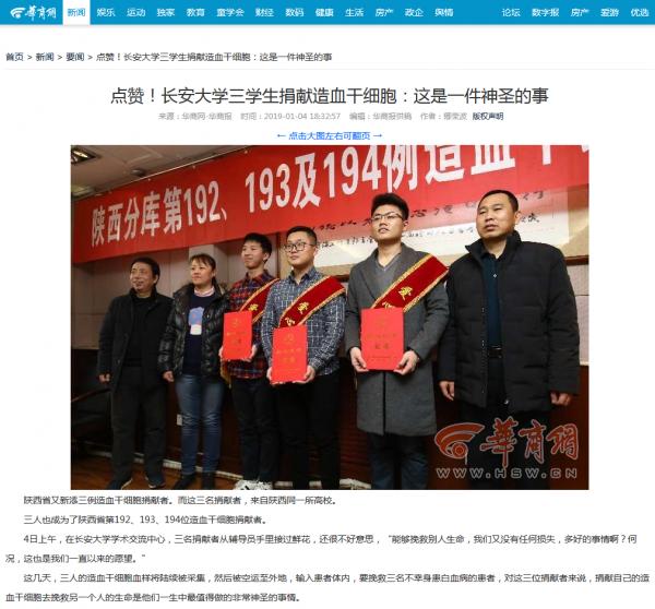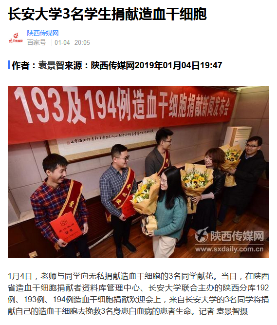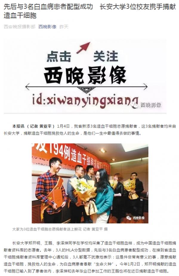 据悉,郑开明同学已于本月2日完成造血干细胞捐献,王鹏和李泽坤同学也将于本月9日和17日进行捐献。自2003年9月我校学生社团——希望阵营启动“生命之光计划——造血干细胞采集捐献”项目以来,长大师生已累计为中华骨髓库陕西分库提供9674份有效血样,已有27位师生成功配型并完成捐献,郑开明同学、王鹏同学和李泽坤同学分别是我校第28、29和30位造血干细胞捐献者。