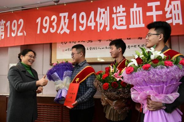 崔岚主任、宋春红书记和赵武刚副书记为造血干细胞捐献同学颁发证书