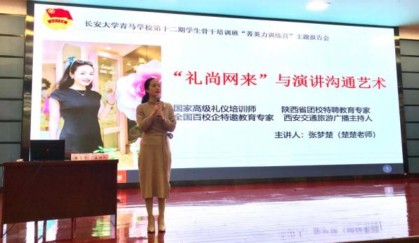 12月18日晚,我校“青马学校”学生骨干培训班专题报告会在北辰楼二楼报告厅举办,国家高级礼仪培训师张梦楚老师应邀为学生骨干作《“礼尚网来”与演讲沟通艺术》培训报告,“青马学校”第十二期学生骨干培训班学员500余人参加报告会。
