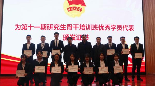 开班仪式上,与会领导和老师为青马学校第十一期研究生骨干培训班秀学员颁发证书;第十一期培训班班委、信息学院范傲雄作上一期培训班工作总结;经管学院成倩倩代表本期培训班学员进行发言;研究生团工委书记刘扬宣读了本期培训班培养方案。