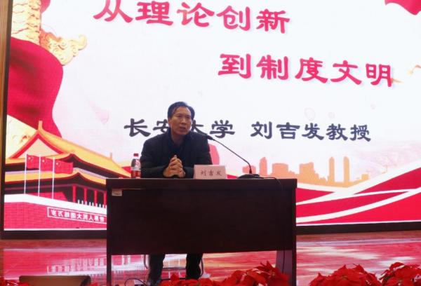 开班仪式结束后,陕西省教学名师、我校马克思主义学院刘吉发教授为培训班学员作了题为“从理论创新到制度文明”的专题报告。报告围绕马克思主义理论创新的理论逻辑;社会主义制度历史演进的制度逻辑;当代中国制度文明形成的实践逻辑三部分展开。刘吉发教授指出,马克思主义理论同国际工人运动相结合、同中国革命实践相结合、同当代中国发展实践相结合分别构成了马克思主义运动化、马克思主义中国化、马克思主义时代化的主体内容。他详细阐述了社会主义制度的历史产生和历史贡献;以及当代中国制度文明形成的三重逻辑。他特别强调了十九届四中全会的历史贡献,并指出,“两个什么”、“两大奇迹”以及“十三大优势”构成了我国当代制度文明建设成果的历史总结,“三大逻辑”、“三大支撑”以及“三大目标”、“十三大任务”则构成了我国当代制度文明建设方向的逻辑引领。